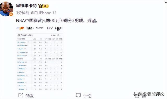 曾凡博NBA首秀0分1抢断引热议 媒体人吐槽10分钟0出手尽显“残酷”